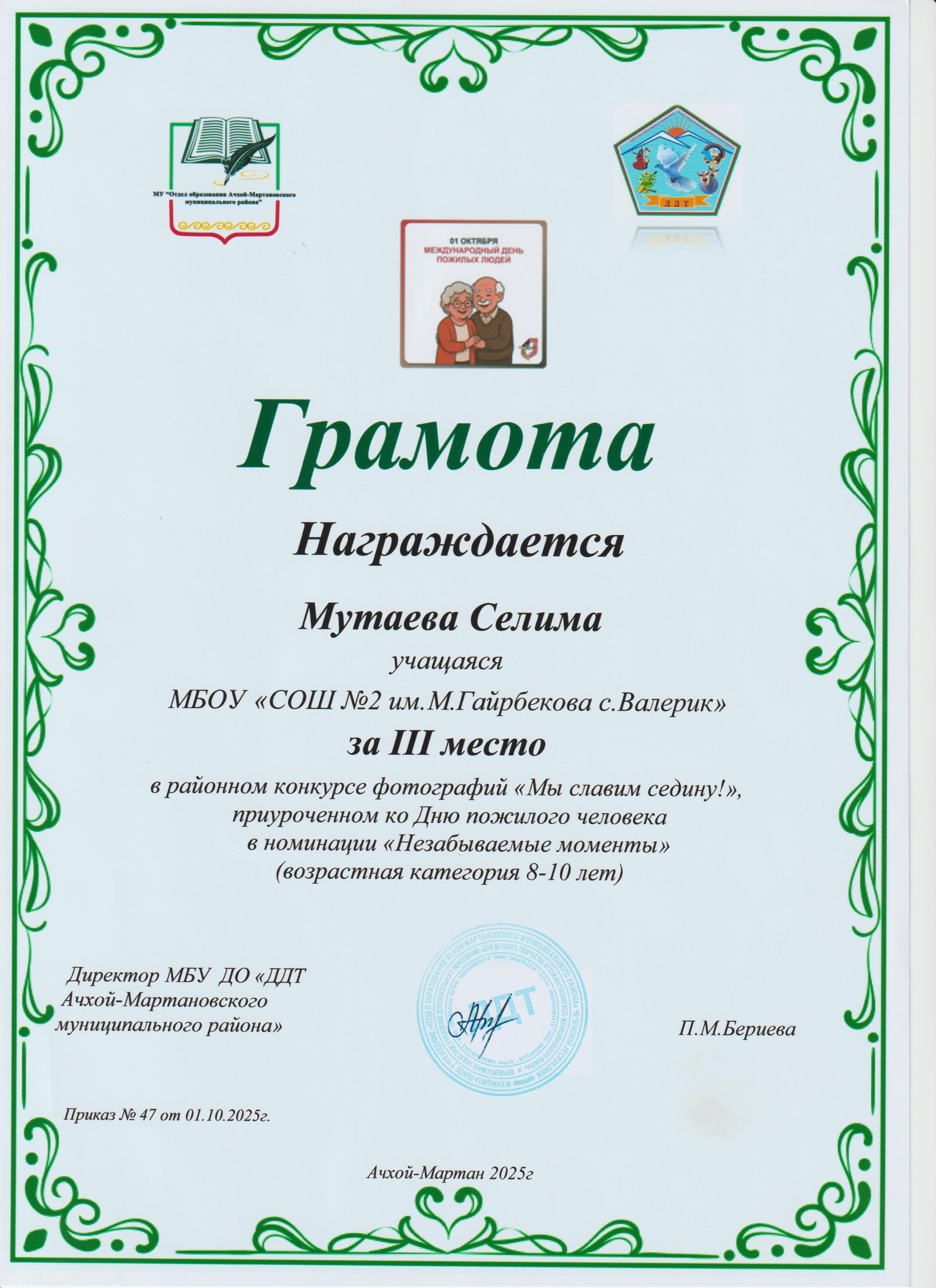 17.10.2025Мутаева Селима, ученица 5 «Б» класса, заняла III-место в районном конкурсе фотографий «Мы славим седину!», приуроченный ко Дню пожилого человека в номинации «Незабываемые моменты». И награждена грамотой за III-место.