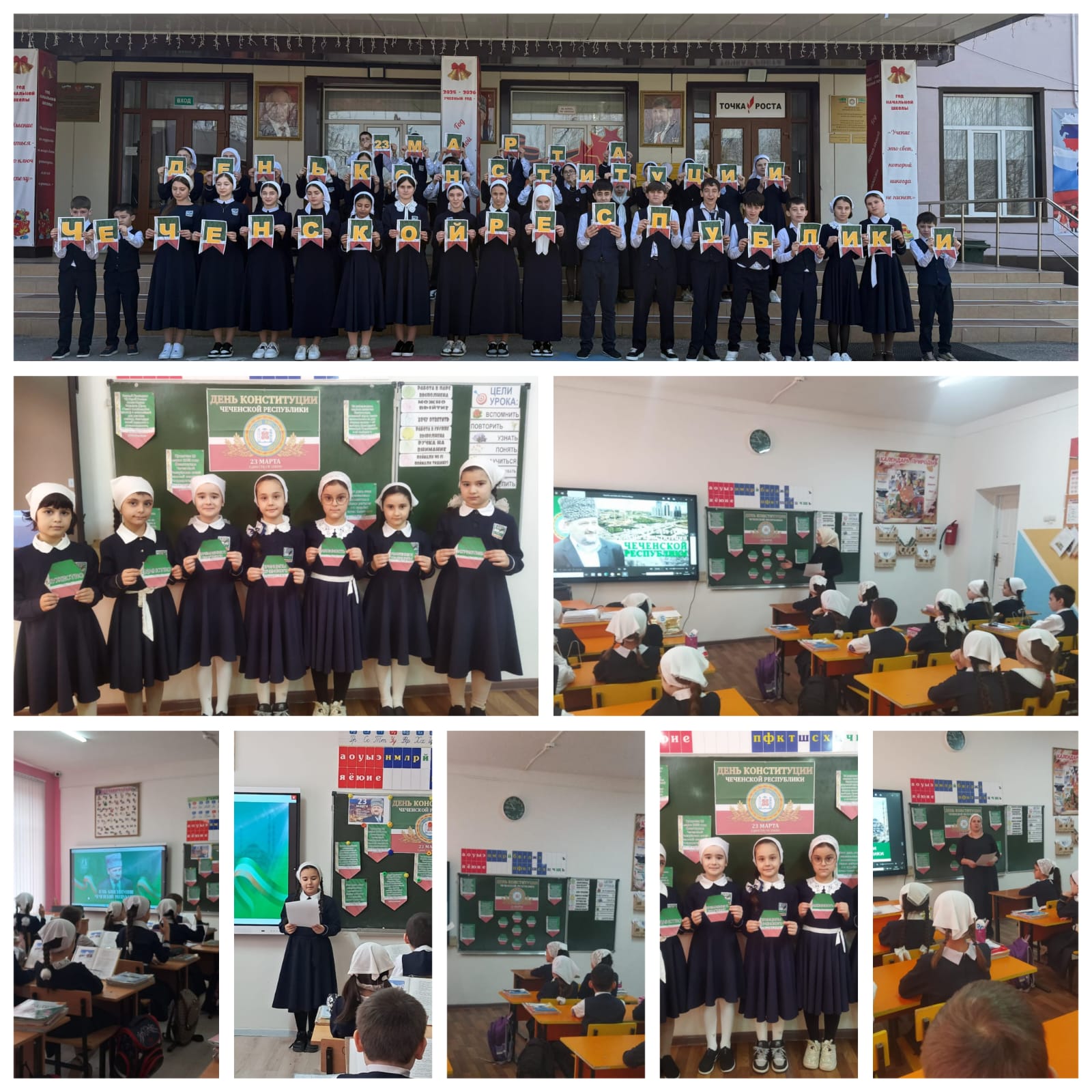 В 1-4 классах проведены классные часы: «Символика Чеченской Республики». В ходе мероприятий обсуждалось современное толкование российских символов, вопросы важнейших конституционных положений, определяющих права и обязанности граждан России. Говорилось и о том, что посягательство на государственные символы во всех странах мира воспринимается как знак неуважения и враждебности к стране и карается законом.